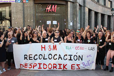 Las trabajadoras de H&M nos sentimos engañadas. Esta empresa siempre ha nos ha dicho que cuida mucho los valores. Pero quedan muy lejos los valores cuando las trabajadoras que deseaban promocionarse, tener un mayor porcentaje de jornada, podían hacerlo con más facilidad en la tienda de Moyúa y ahora nos encontramos con que la tienda que para ellos era su “tienda estrella” se cierra. A las trabajadoras que prestamos los servicios en esta tienda nos mandan a ciudades a las cuales es imposible que nos podamos desplazar, ya que entre otros motivos, la mayoría somos madres o disfrutamos de contratos a tiempo parcial. Además nos quieren liquidar por cuatro duros. Esto no estamos dispuestas a aceptarlo. Muchas de nosotras pensábamos jubilarnos en H&M. Todas juntas vamos a pelear para que por unas condiciones dignas de todas las trabajadoras. (Fuente: LAB)