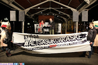 La tarde de este martes 5 de junio, se han realizado sendas concentraciones ruidosas en Portugalete y Sestao, en las que han participado vecinas y vecinos de Ezkerraldea, quienes con cacerolas y pitos han querido expresar su total rechazo ante lo que consideran un “montaje policial”, ante las detenciones e inminente ingreso en prisión sin fianza de 4 de los jóvenes de Altsasu, Jon Ander Cob, Aratz Urrizola, Iñaki Abad y Julen Goikoetxea, condenados la semana pasada por la Audiencia Nacional española con penas de entre 9 y 13 años de cárcel por una trifulca de bar con dos guardias civiles y sus parejas en octubre de 2016.