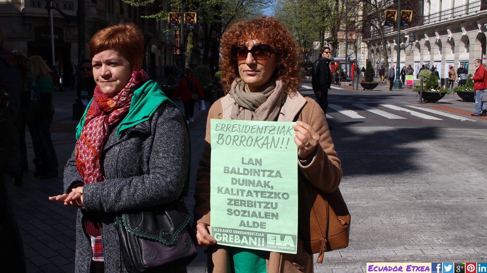 Trabajadoras de la residencia Sanitas Loramendi de Erandio denuncian frente al Museo Guggenheim de Bilbao con el apoyo de los sindicatos ELA, LAB y UGT-Euskadi, la precariedad de sus condiciones laborales, más aún en el caso de la plantilla del equipo de limpieza, quienes afirman que "estamos hechas un cuadro" y anuncian huelga diaria indefinida desde el próximo día 20 de octubre. "malitas estamos".