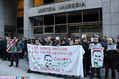 La plataforma “Iñigo Gogoan” ha realizado la mañana de este miércoles 24 de enero frente a los Juzgados de Bilbao (C/Barroeta Aldamar) una concentración para denunciar la demanda interpuesta por “Ugarteko”, el mando de la Ertzaintza encargado del operativo la noche en que Iñigo Cabacas recibió el impacto de una pelota de goma que le causó la muerte (05/04/2012), contra la abogada de la familia de Iñigo, Jone Goirizelaia, contra el diario GARA, NAIZ y su director, Iñaki Soto, así como también contra el periodista Iñaki Iriondo, a los que pide 250.000 euros de indemnización y acusa de daños en su honor y su intimidad por la publicación de unas grabaciones en las que se escuchaban las órdenes de “Ugarteko” la noche en que Iñigo murió. Mientras, el juicio de 6 ertzainas por la muerte de Iñigo aún a día de hoy sigue sin fecha.